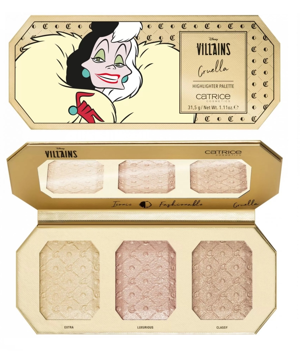 تتميز لوحة هايلايتر ديزني فيلينز كرويلا من كاتريس بالعديد من المزايا: تركيبة البودرة الكريمية لا تضمن فقط التوهج المثالي، بل تتيح لك الظلال المختلفة أيضًا الاختيار بين ثلاثة ظلال. وهذا ليس كل شيء: تم تصوير كرويلا دي فيل على العبوة - وهي لافتة للنظر تمامًا. يمكن تطبيق الملمس بشكل مثالي باستخدام فرشاة أورسولا هايلايتر من مجموعة أدوات المكياج وحقيبة إيسينس ديزني فيلينز. توفر لوحة الهايلايتر ظلالًا مختلفة لتسليط الضوء على ملامح الوجه. يمكن استخدام الظلال بشكل فردي أو مزجها معًا. من الأفضل تطبيق الملمس باستخدام فرشاة الهايلايتر. لتجنب وضع الكثير من الملمس على الوجه مرة واحدة، ربتي بالفرشاة على ظهر يدك مسبقًا. للحصول على تأثير أكثر كثافة، يمكن وضع عدة طبقات رقيقة فوق بعضها البعض.