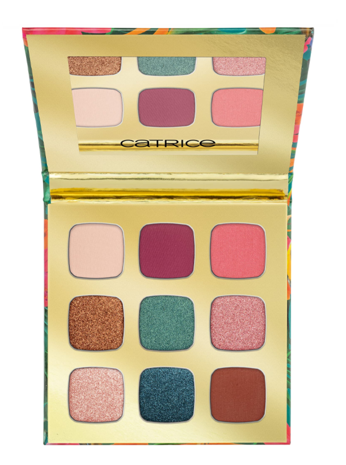 تضمن لوحة ظلال العيون Tropic Exotic تسعة ظلال فريدة وممزوجة بشكل مثالي في لمسات نهائية متنوعة. تضفي الألوان الناعمة والذهبية والوردية، بالإضافة إلى درجات اللون الأخضر المكثفة، مجموعة متنوعة من الإطلالات، حتى أثناء التنقل، وذلك بفضل المرآة المدمجة. بفضل تصميمها الاستثنائي، تعد اللوحة نفسها ملفتة للنظر: حيث تذكرنا أوراق النخيل الخضراء والببغاوات الصفراء والزرقاء والزهور الغريبة على العبوة بالغابات الاستوائية والأدغال.
